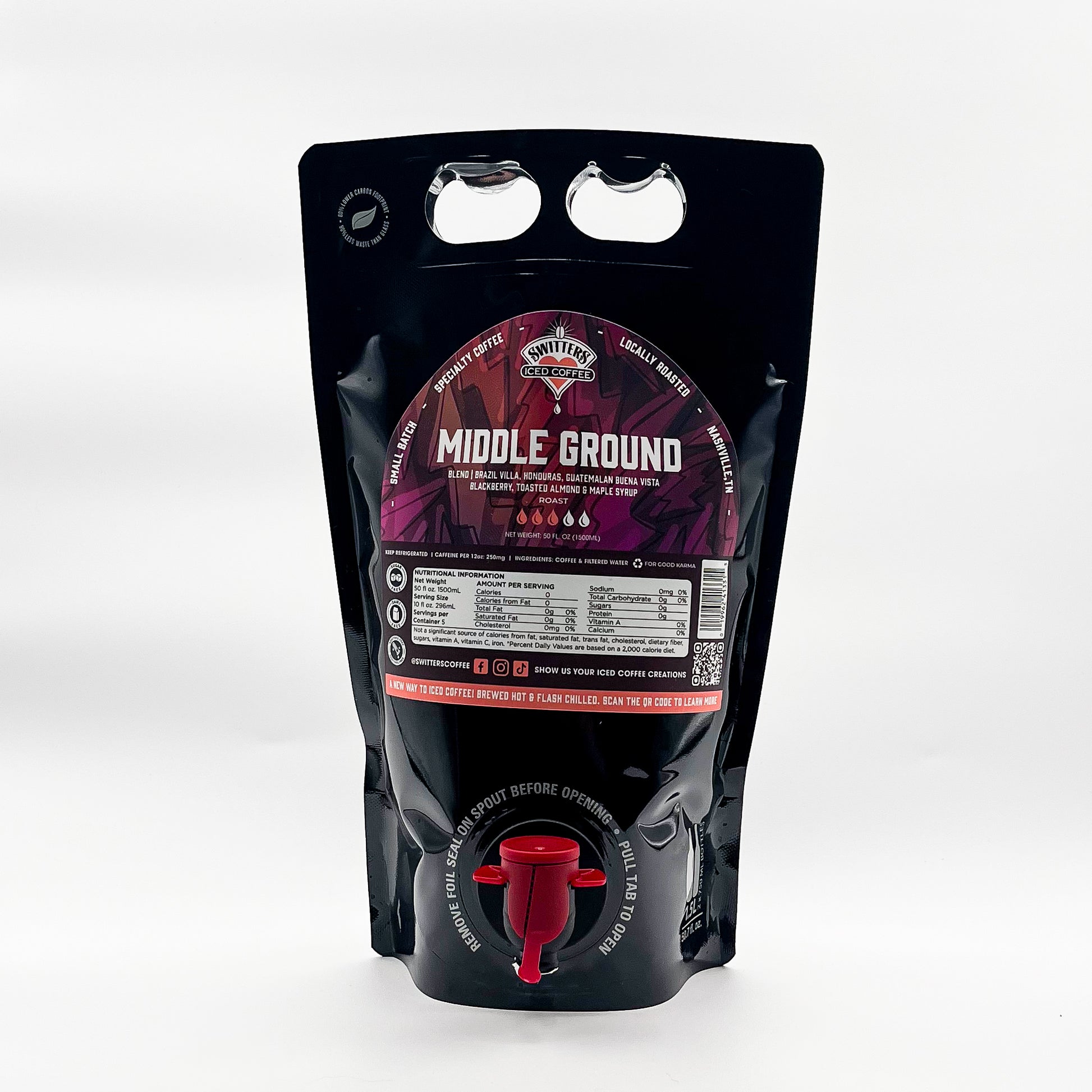 MIDDLE GROUND- Our Medium Ground coffee is the embodiment of harmony, this blend of coffee combines beans sourced from Brazil, Mexico, and Guatemala. It takes the best qualities from each region to create the perfect balance in each sip– a delicious blend of natural sweetness like maple syrup, the intrigue of tartness similar to a blackberry, and the cozy nutty warmth of toasted almonds. The Middle Ground is a medium-body iced coffee with a bright acidity to make it the crowd-pleaser, the go-to for everyone who seeks a little balance in their cup.
